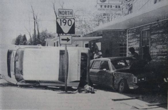 May, 16th 1984 – Seen is an automobile accident in downtown Palmersville in 1984. An Oldsmobile (right) driven by Kenneth Moore with passenger six year old Ben Moore, and a 1964 Ford Galaxy 500 operated by Tim Edenfield collided at the intersection of TN State Highways 190 and 89. Moore’s vehicle came to rest on Workmans Grocery storefront. Seen in the background is Oliver’s Service Station. Occupants of both vehicles sustained minor injuries