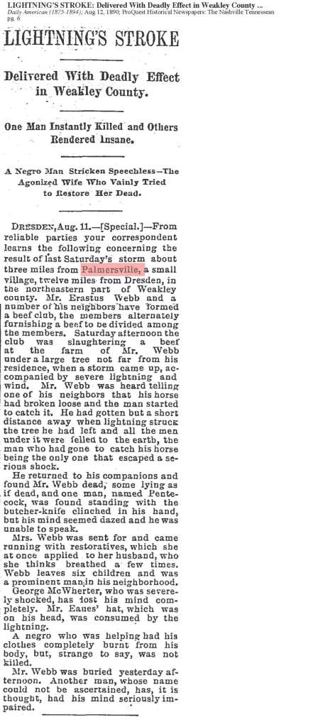 From reliable parties your correspondent learns the following concerning the result of last Saturday’s storm about three miles from Palmersville, a small village, twelve miles from Dresden, in the northeastern part of Weakley County. Mr. Erastus Webb and a number of h!s neighbors have formed a beef club, the members alternately furnishing a beef to be divided among the members. Saturday afternoon the club was slaughtering a beef at the farm of Mr. Webb under a large tree not far from his residence when a storm came up, accompanied by severe lightning and wind, Mr. Webb was heard telling one of his neighbors that his horse had broken loose and the man started to catch it. He had gotten but a short distance away when lightning struck the tree he had left and all the men under it were felled to the earth, the man who had gone to catch his horse being the only one that escaped a serious shock.
