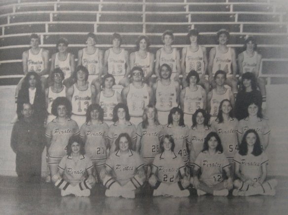 The 1980 Pirates and Lady Pirates basketball teams. They are wearing new uniforms purchased by the former Weakley County Bank through a community support program. Weakley County Bank employees, Carol Ann Smith and Brenda Donoho are featured representing the bank. Coach Robert Richards is also seen in the photo, along with both boys and girls teams – Photo courtesy of the Dresden Enterprise.