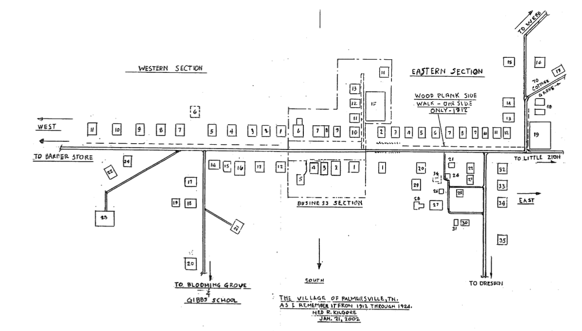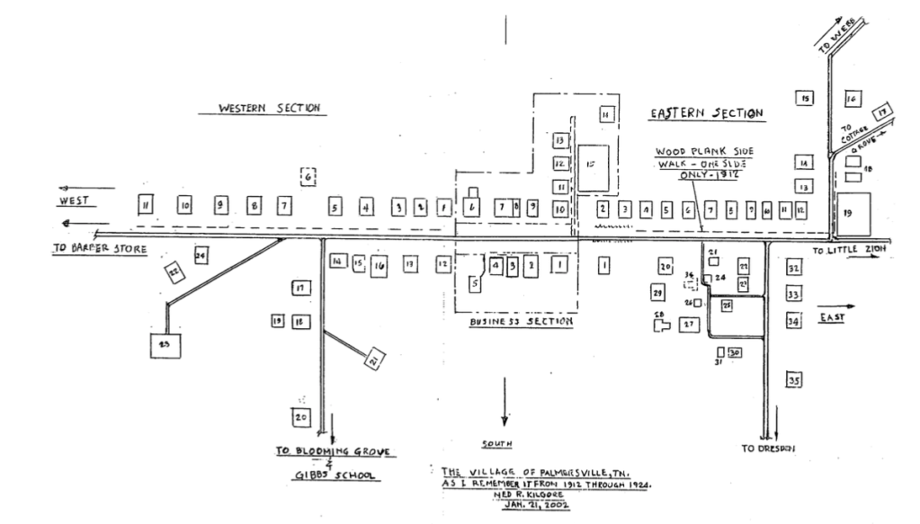 Map of Palmerville c. 1912 – 1924 Posted on January 28, 2022 by Palmersville Historical Society Ned R Kilgore drew this map in January 2002, based on his memories of town. Click on the image to see a larger version. Download the map and legend using the link below. Download the Map and Legend PDF Here Share this: Click to share on X (Opens in new window) X Click to share on Facebook (Opens in new window) Facebook Like Loading... Related